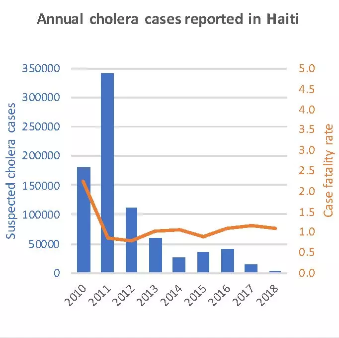 In Haiti, no cases of cholera have been confirmed since February 2019[1]. This represents the first lull period in cholera cases in the country since the bacterium was inadvertently imported nine years ago[2,3]. Between 2010 and 2018, a total of 813,261 suspected cholera cases, including 9,611 deaths, have been reported in Haiti[4].