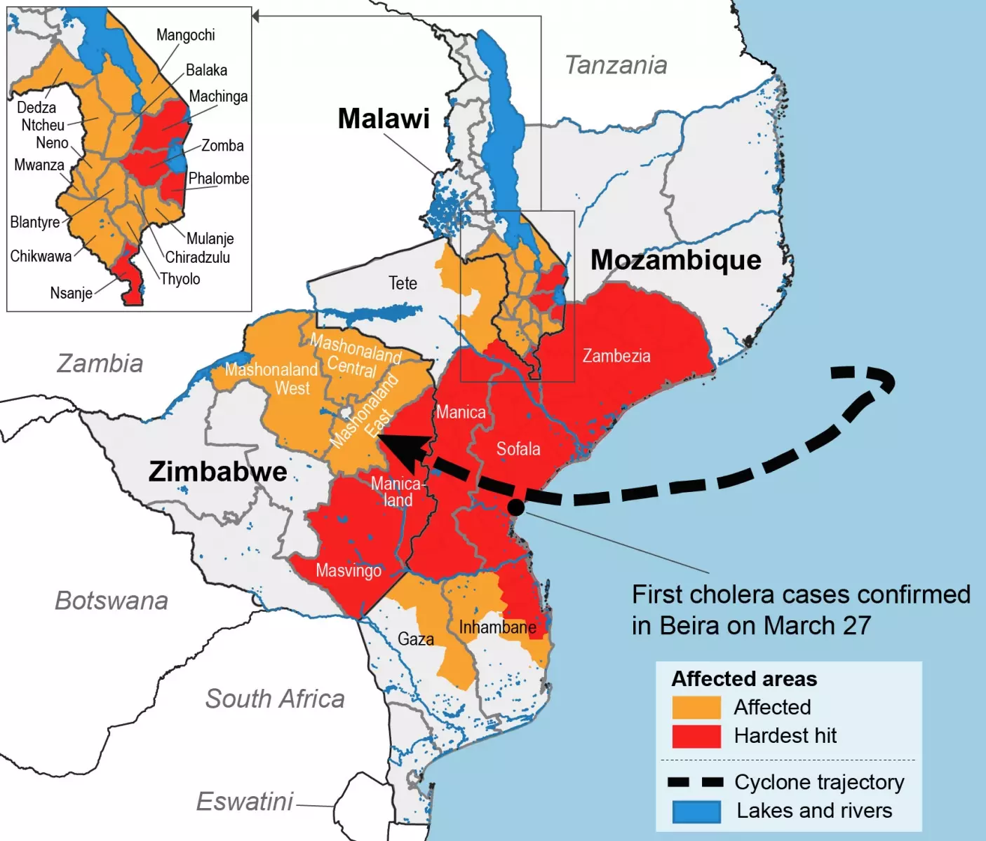 The port city of Beira in Mozambique was hit hardest, with many homes submerged and destroyed and healthcare infrastructure severely damaged. According to Médecins Sans Frontières, 90% of the area around Beira has been damaged, with roads and electricity cut off. The city’s water supply system has also been substantially damaged, forcing many people to drink from contaminated wells or stagnant water. As a result of the lack of access to clean water and increasingly squalid living conditions, the government announced the first recorded cases of cholera on March 27, in which five cholera cases were discovered in Munhava, one of the poorest neighborhoods of Beira. The number of cholera cases has reportedly jumped to at least 139 by March 29. The World Health Organization has warned of a “second disaster” if cholera spreads in the cyclone-affected region.
